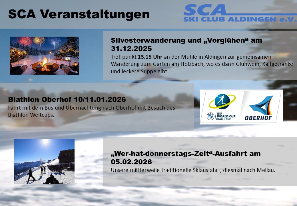 - “Wer-hat-donnerstags-Zeit” Ausfahrt 2026Die Anmeldung zu unserer mittlerweile traditionellen Tagesausfahrt unter der Woche, um genau zu sein an einem Donnerstag, ist freigeschalten. Ab sofort könnt ihr Euch zu dieser beliebten Ausfahrt anmelden. In diesem Winter geht es erstmals nach Mellau. Auch hier hoffen wir wieder auf freie Straßen und freie Pisten. Und auch hier werden wir den Skitag… “Wer-hat-donnerstags-Zeit” Ausfahrt 2026 weiterlesen