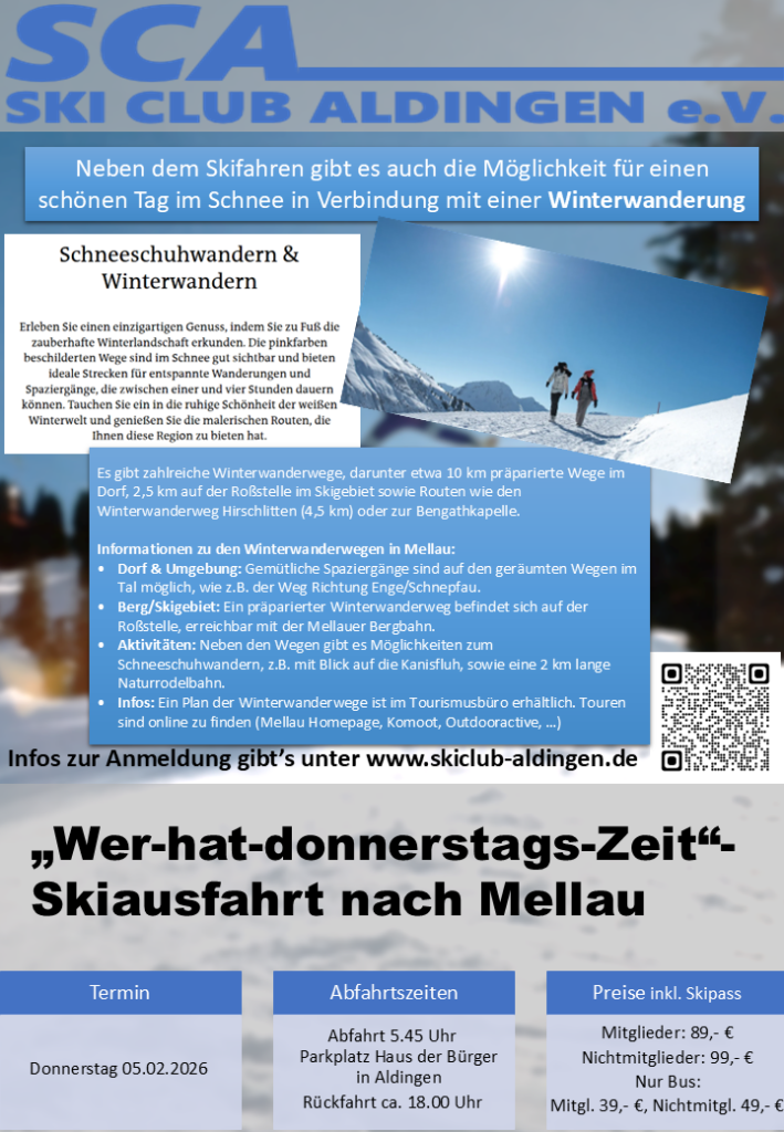 Am 05.02.26 findet unsere “Wer-hat-donnerstags-Zeit” Ausfahrt statt. Dieses Jahr fahren wir nach Mellau!